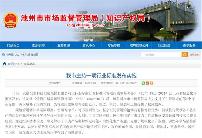 恒生集團(tuán)多年來致力于管道搶修安裝領(lǐng)域的技術(shù)與裝備研發(fā),并已發(fā)展成為集微電子、機(jī)械、化工及彈性體密封件制造等為一體,擁有多家控股子公司的多元化、現(xiàn)代化企業(yè)。恒生集團(tuán)是“安徽省高新技術(shù)企業(yè)”和“國家知識(shí)產(chǎn)權(quán)優(yōu)勢企業(yè)”,是多種材料標(biāo)準(zhǔn)的主要起草單位,2015年國家工信部批準(zhǔn)了由恒生集團(tuán)主持起草《管道用球墨鑄鐵修補(bǔ)器》的國家行業(yè)標(biāo)準(zhǔn),該標(biāo)準(zhǔn)將于2018年9月開始實(shí)施,這對(duì)引導(dǎo)國內(nèi)管道修補(bǔ)器行業(yè)的發(fā)展有著積極而深遠(yuǎn)的意義。